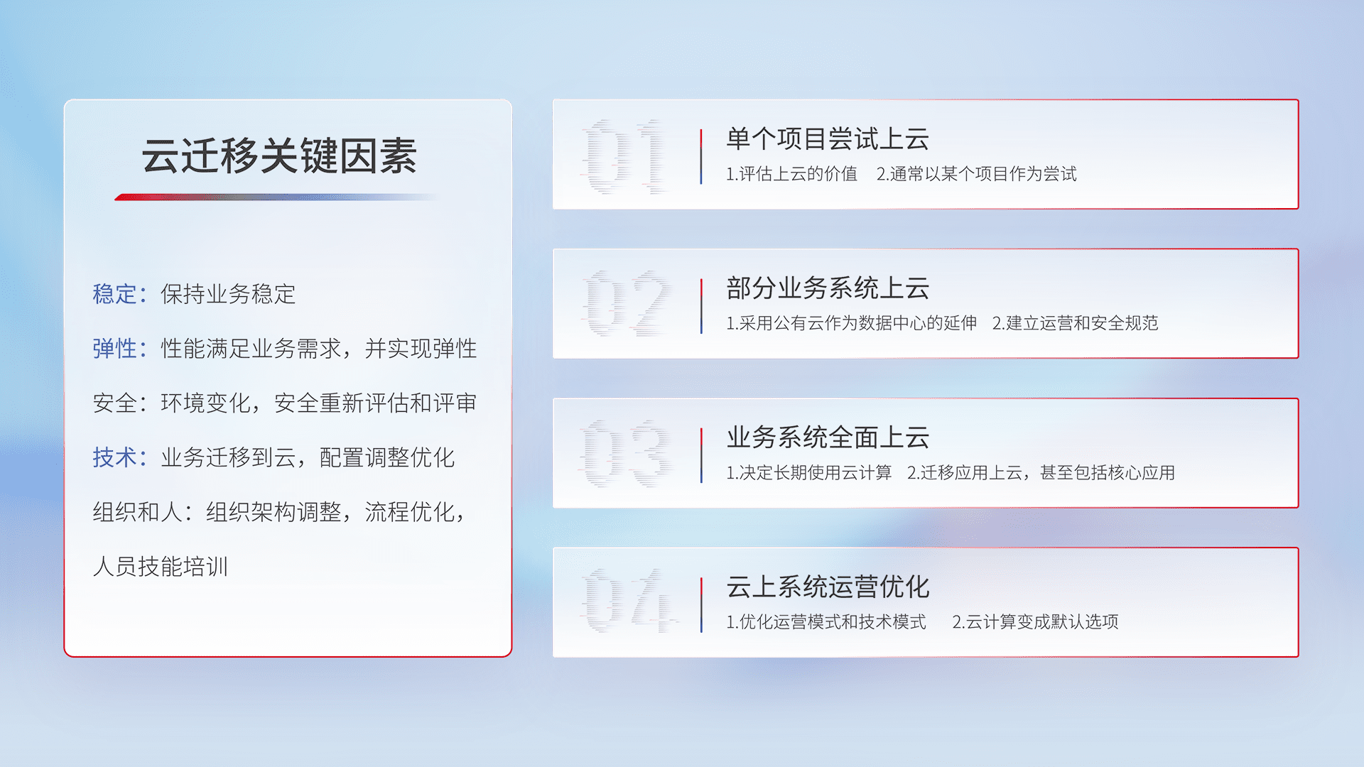 结合实际业务,,,,从规划设计、、、云平台选型、、、云原生改造、、数据迁移、、集成交付,,迁移全过程为客户识别最佳上云路径,,,做好风险识别管理,,设计网络架构、、身份权限、、安全审计合规、、、操作审计、、、、日志审计、、、监控告警策略、、、多站点容灾设计等,,对云上基础设施进行整体规划,,提升IT治理水平,,,以满足弹性、、高可用、、、高性能的需求。。。。