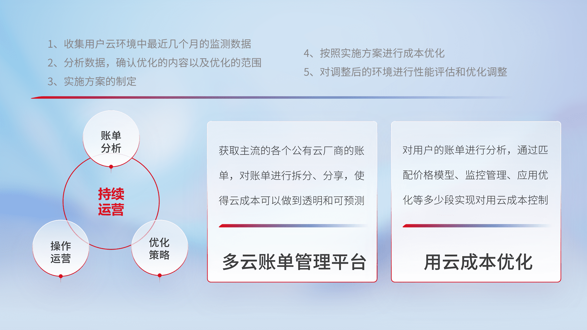 通过多云纳管,,,,以统一的资源数据模型把客户的云资源进行抽象和封装,,,进而实现对多云资源的统一操作,,保障云资源管理的可靠性、、稳定性与可用性。。。量身定制化运维内容,,配置、、、开发运维、、补丁管理、、、、备份、、监控、、、、认证和访问管理、、审计和日常巡检等,,,,保障在用云过程中的可靠度,,,稳定度以及高可用率。。。